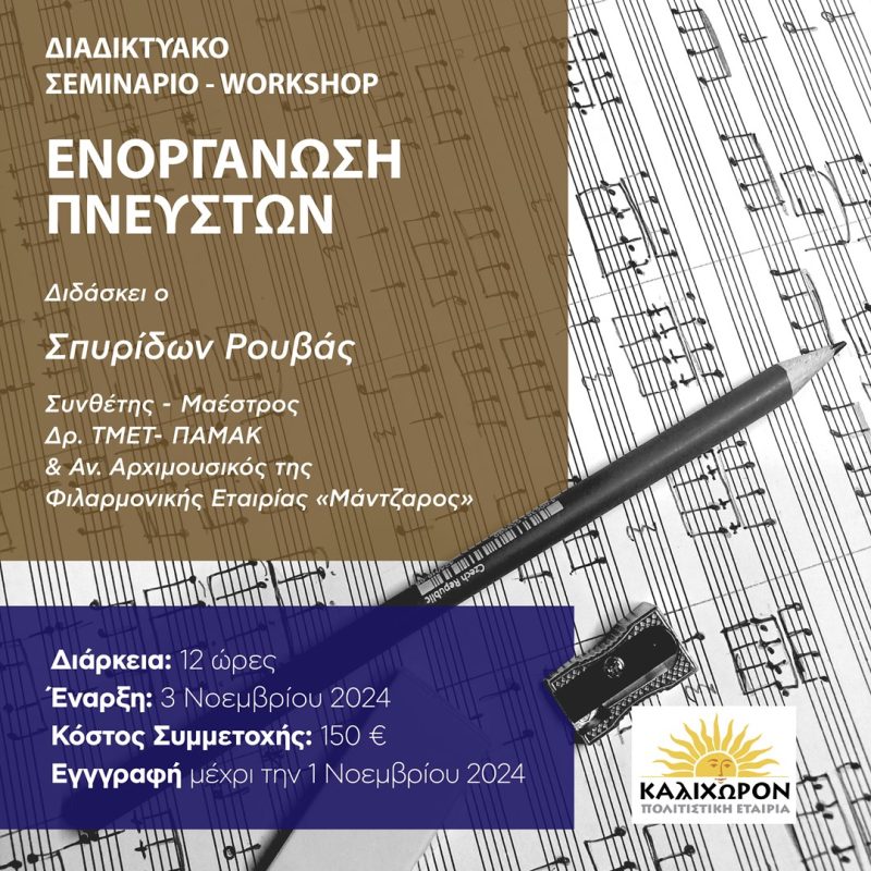 Την διοργάνωση Σεμιναρίου – Workshop «Ενοργάνωσης Πνευστών», υπό την καθοδήγηση του καταξιωμένου συνθέτη και μαέστρου, Σπυρίδωνα Ρουβά διοργανώνει η Αστική Μη Κερδοσκοπική Πολιτιστική Εταιρεία “ΚΑΛΛΙΧΩΡΟΝ”.
